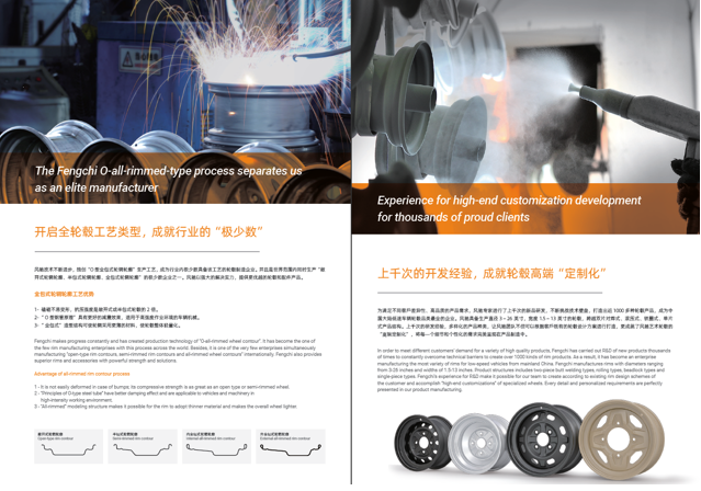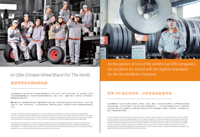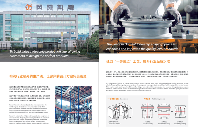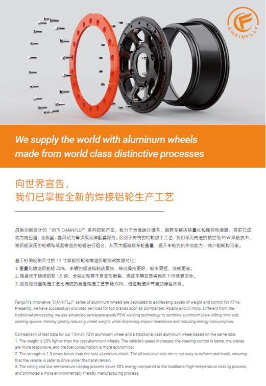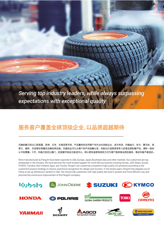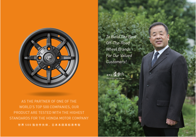浙江風馳機械有限公司,成立于1994年,伴隨著時間的飛逝,一直以工匠精神專注生產(chǎn)非公路低速車輛輪轂,在董事長潘衛(wèi)民的英明帶領下,風馳以自信、沉穩(wěn)、堅實的腳步,企業(yè)逐步成為了世界500強合作伙伴、申請了企業(yè)獨有的輪輞品牌、創(chuàng)立了旗下5家子公司、獨創(chuàng)特殊工藝、產(chǎn)品革新?lián)Q代,一直以實現(xiàn)“引領低速車輪發(fā)展,為中國制造正名”的使命及成為“全球知名低速車輛制造企業(yè)的最佳戰(zhàn)略合作伙伴”為愿景而一直努力著。